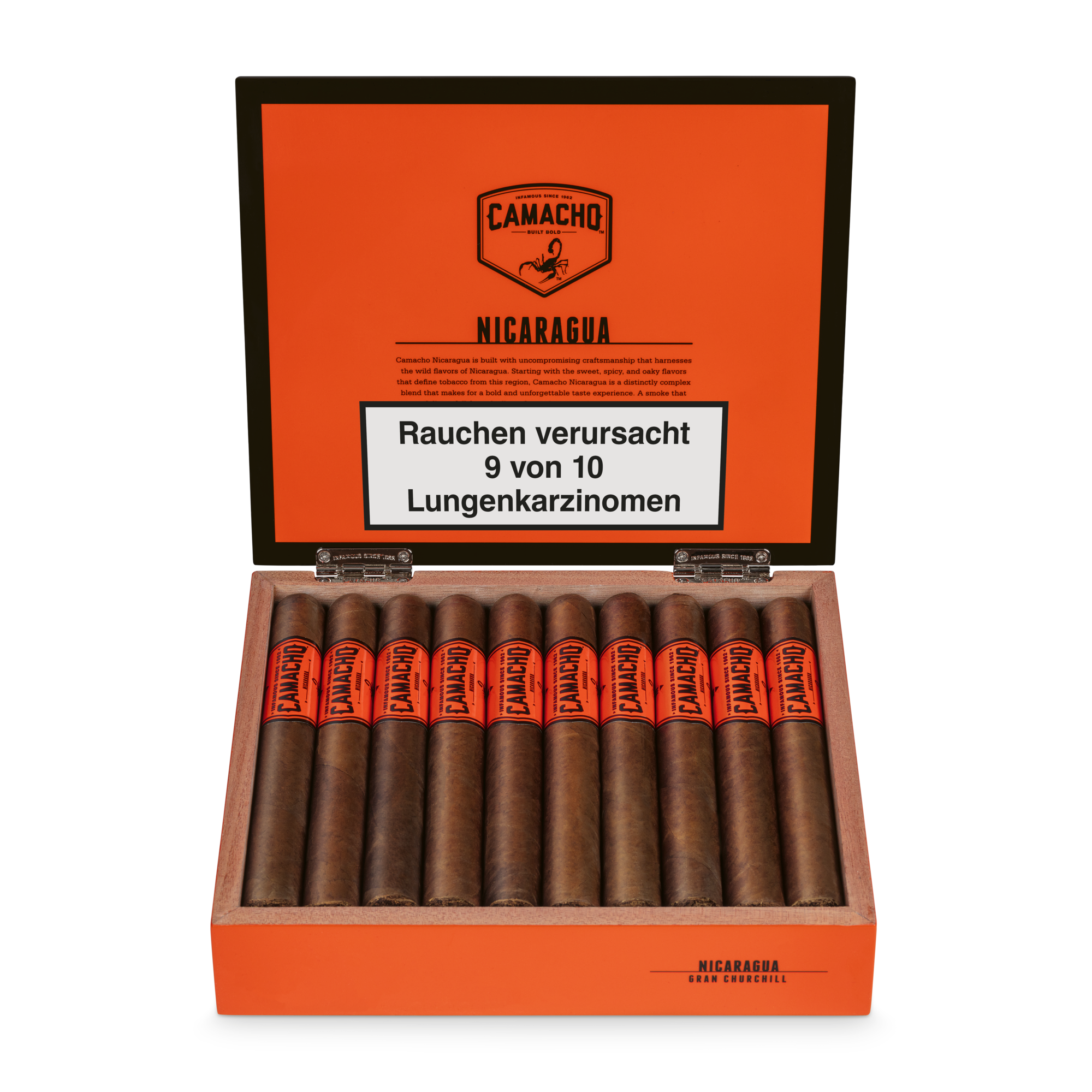 Camacho Nicaragua Zigarren - Im Feuer Nicaraguas geschmiedet. Mit kompromissloser Kunstfertigkeit hergestellt, nutzen unsere Blender die unbändigen und einzigartigen Aromen Nicaraguas um einen ausgesprochen komplexen Blend mit einem unvergleichlichen Geschmackserlebnis zu kreieren. Manche Dinge lassen sich nicht zähmen. Diese Zigarren gehören definitiv dazu. Den Lautstärkeregler am Anschlag und das Gaspedal bis ans das Bodenblech durchgetreten, war Inspiration um die süssen und eichenen Aromen aus dem vulkanischen Boden in diese Kraftpakete zu bündeln und die Herzen der Camacho Geniesser höher schlagen zu lassen.