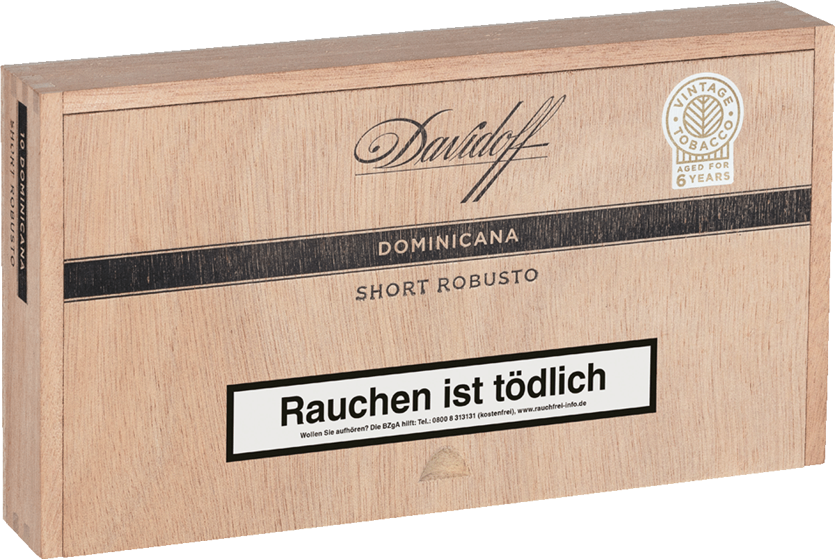 Die Davidoff Dominicana ist in drei beliebten Formaten erhältlich: als Toro, als Robusto und als Short Robusto, wenn die Zeit mal knapp ist. Alle drei tragen die Pigtail-Kappe als Zeichen der Handwerkskunst und heben ihren Vintage-Blend durch den goldenen Fußring (Angabe des Erntejahrs) hervor. Erhältlich in einer klassischen 10-er Cabinet Holzkiste mit einem Vintage-Aufkleber, der die Exklusivität dieser Zigarren unterstreicht.