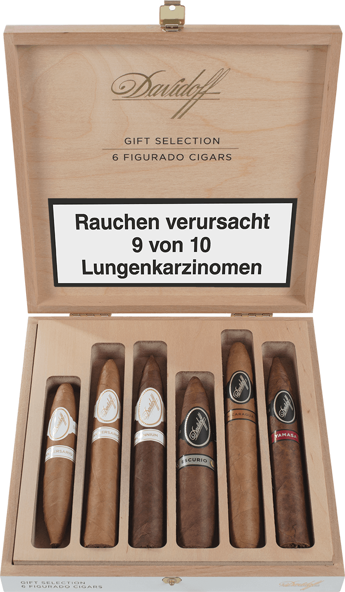 Diese Auswahl von 6 beliebten Davidoff Zigarren im Figurado Format sind in einem premium Geschenkset verpackt, eine Melange aus Geschmacksvielfalt und Handwerkskunst. Das perfekte Geschenk für jeden Zigarrenliebhaber.