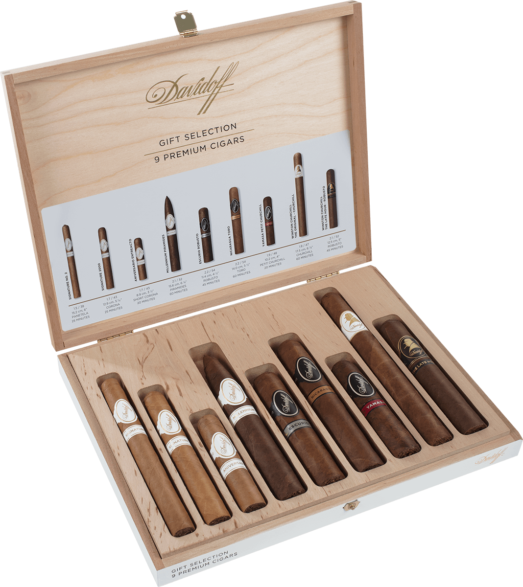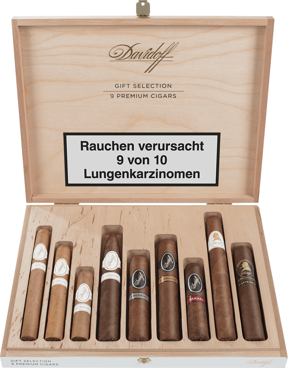 Diese Auswahl von Davidoff Bestsellern ist das perfekte Geschenk für jeden Aficionado. Hier ist für jeden Geschmack etwas dabei. Verpackt ist diese exquisite Auswahl in einem hübschen, modernen Holz-Geschenkkistchen. Mit neun wunderschönen Formaten das ideale Geschenk für Liebhaber von Premium Zigarren aus allen Ländern der Davidoff Welt.