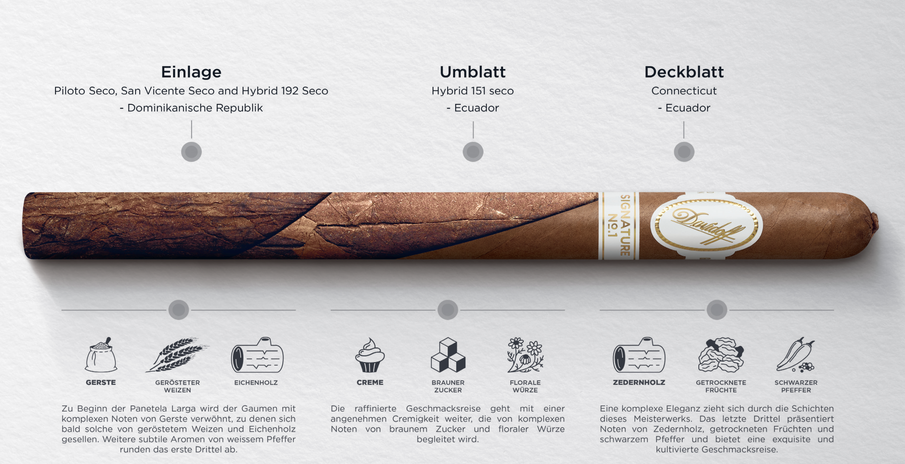 Die Aromen sind subtil und verlockend wie eh und je. Das spannende Zusammenspiel von Gerste, Creme und Zedernholz lässt sich nur schwer in Worte fassen - stattdessen rollen wir es in eine Zigarre, die Bände spricht. Jetzt haben Aficionados noch einmal das Privileg, eine der beliebtesten Kreationen der Zigarrenwelt zu geniessen. Jede einzelne Davidoff Signature No. 1 erzählt eine spannende Geschichte mit unerwarteten Ereignissen und Wendungen. Wie ein gutes Buch, werden Sie diese Zigarre nicht aus der der Hand legen können.