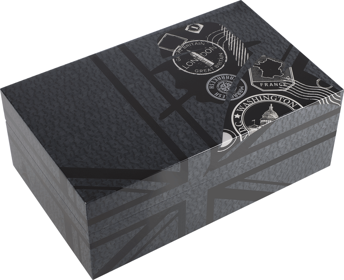 Dieser Humidor besteht aus Holzfaserwerk, das in der Verarbeitung zuerst zerlegt und dann wieder zusammengesetzt wird, woraus die besondere Optik mit neuen Texturen und Farben resultiert. Er wurde aus umweltfreundlichen Holz in Italien hergestellt und zeigt die berühmte Winston Churchill Silhouette und die Lieblingsreiseziele von Sir Winston.