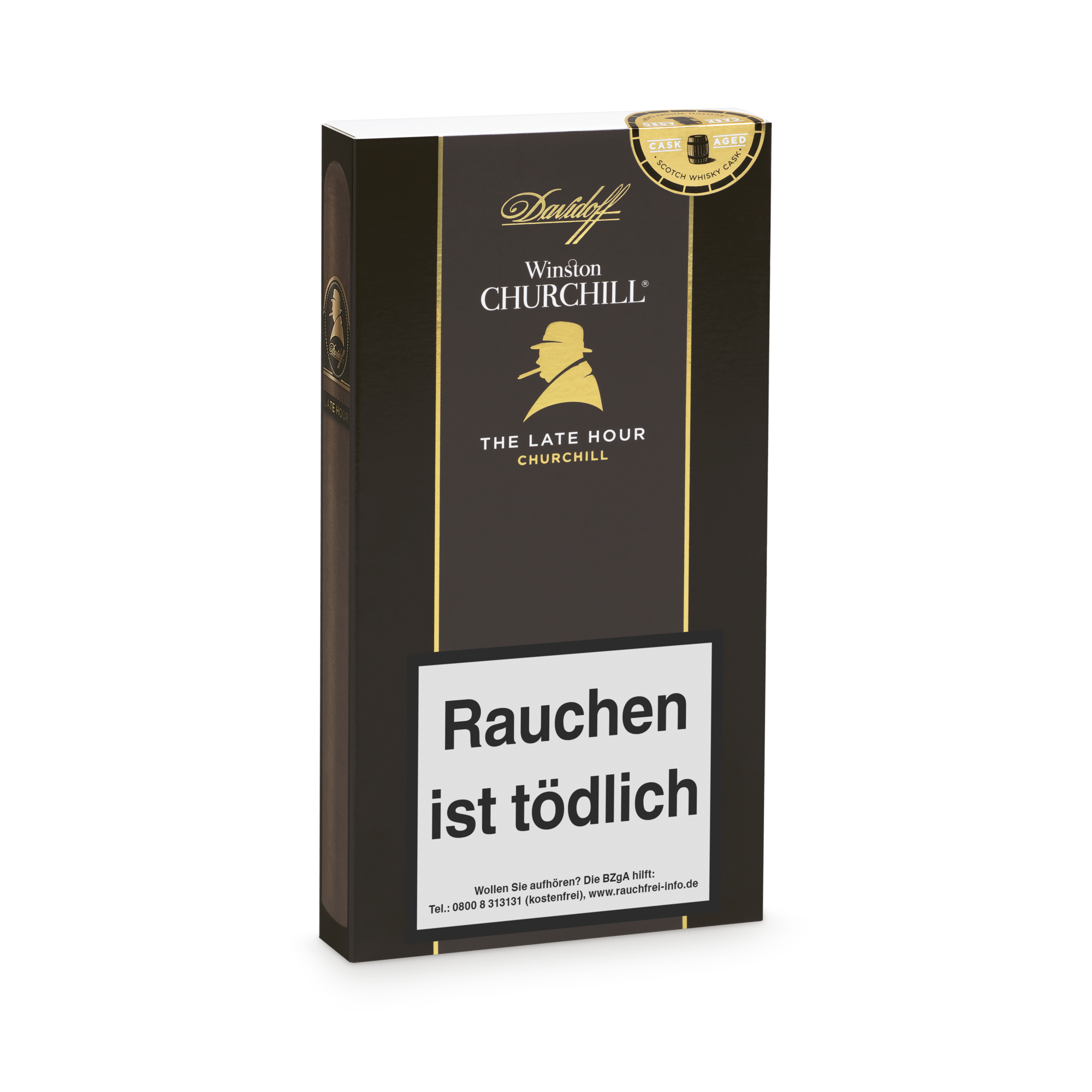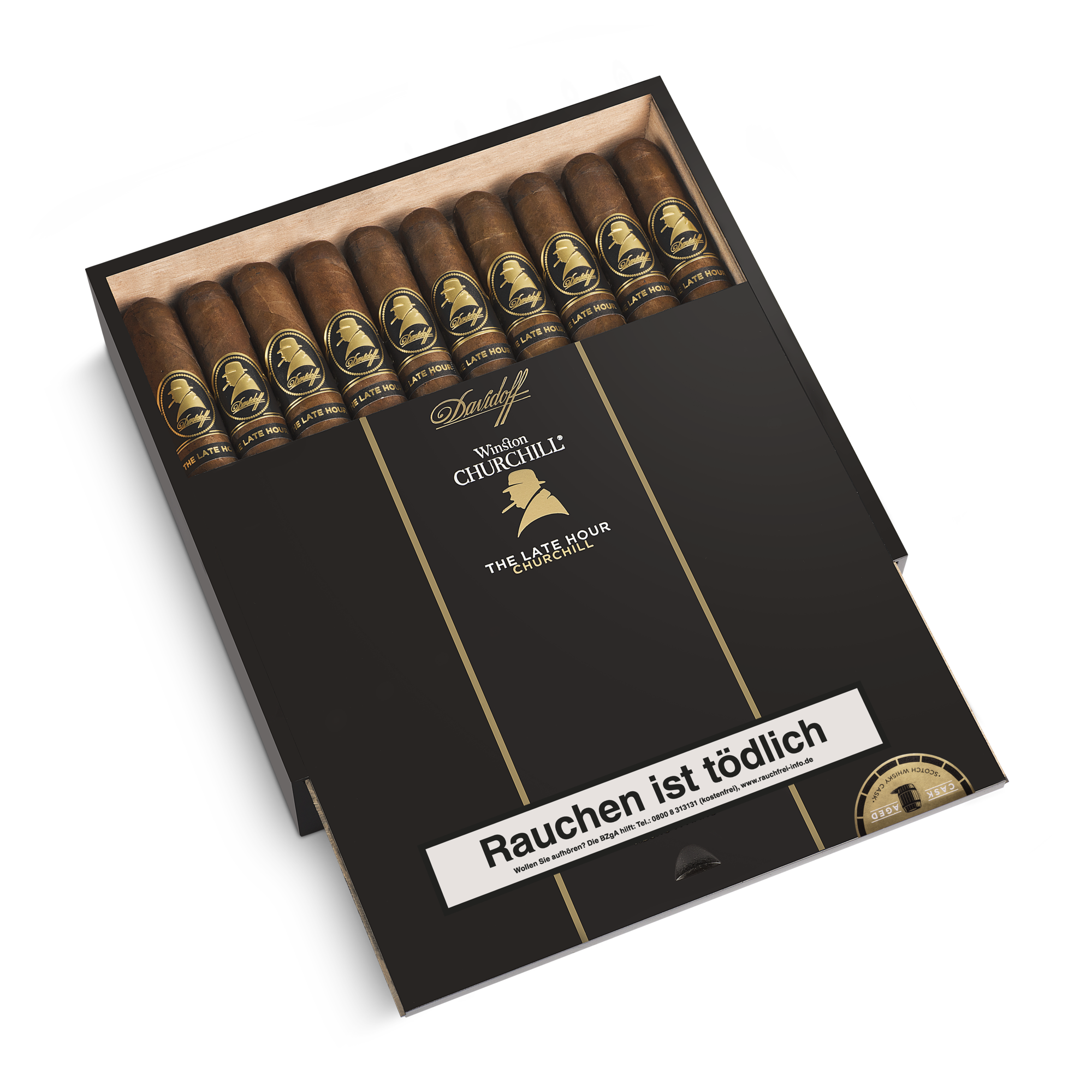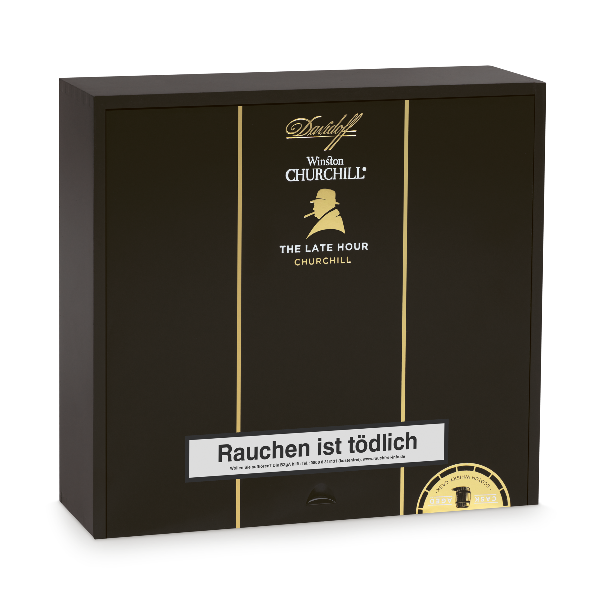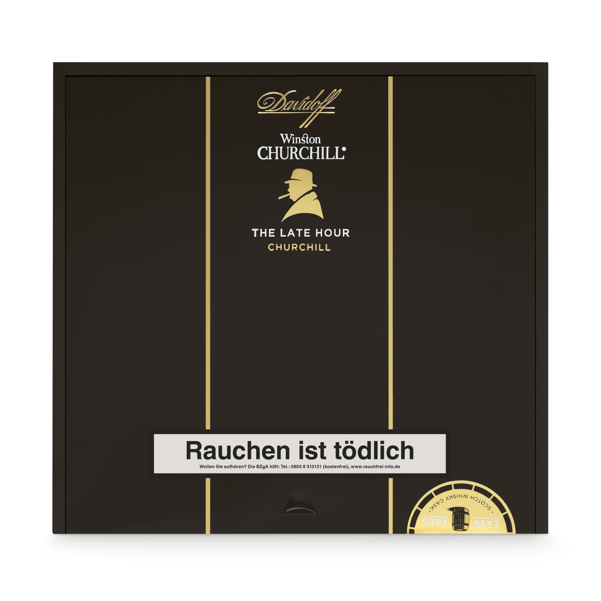 Wenn das Ende des Abends der Beginn von etwas Neuem ist. Und die Nacht von interessanten Gedanken und Diskussionen begleitet wird, ist dies der Moment für die - The Late Hour. Die Zigarre selbst sollte Gegenstand von Gesprächen sein, denn sie hat ihre eigene, einzigartige Geschichte. Ihr Tabak ist in Fässern von edelstem Scotch Single Malt Whisky gereift. Dies verleiht der Zigarre eine einzigartige Komplexität, Tiefe und ausgesprochen reiche Aromen, welche gleichzeitig Ihren Gaumen und Ihre Gespräche stimulieren werden. Die beiden Einlagetabake aus Nicaragua, die in den mineralstoffreichen Vulkanböden von Condega und Estelí angebaut werden, verleihen der Zigarre Würze und Charakter. Insbesondere der Condega Visus aus Nicaragua der in original Scotch Single Malt Whiskyfässern reift, geben der Zigarre eine mysteriöse Süße und geschmackliche Tiefe. Die beiden verschiedenen Visus Einlagetabake aus der Dominikanischen Republik und das dunkle mexikanische Umblatt, erzeugen zusammen die Komplexität dieser vollmundigen Mischung. Ausgeprägte Geschmacksrichtungen und Aromen verwöhnen den Gaumen mit wechselnden Noten von schwarzem Pfeffer, dunklem Kaffee, Süße, altem Leder, Holz und Würze. Um die Dunkelheit der Nacht wider zu spiegeln, in welcher Sir Winston am kreativsten war, hat Davidoff ein glänzendes und öliges Deckblatt aus Ecuador in einem satten, dunklen Schokoladenton ausgewählt.