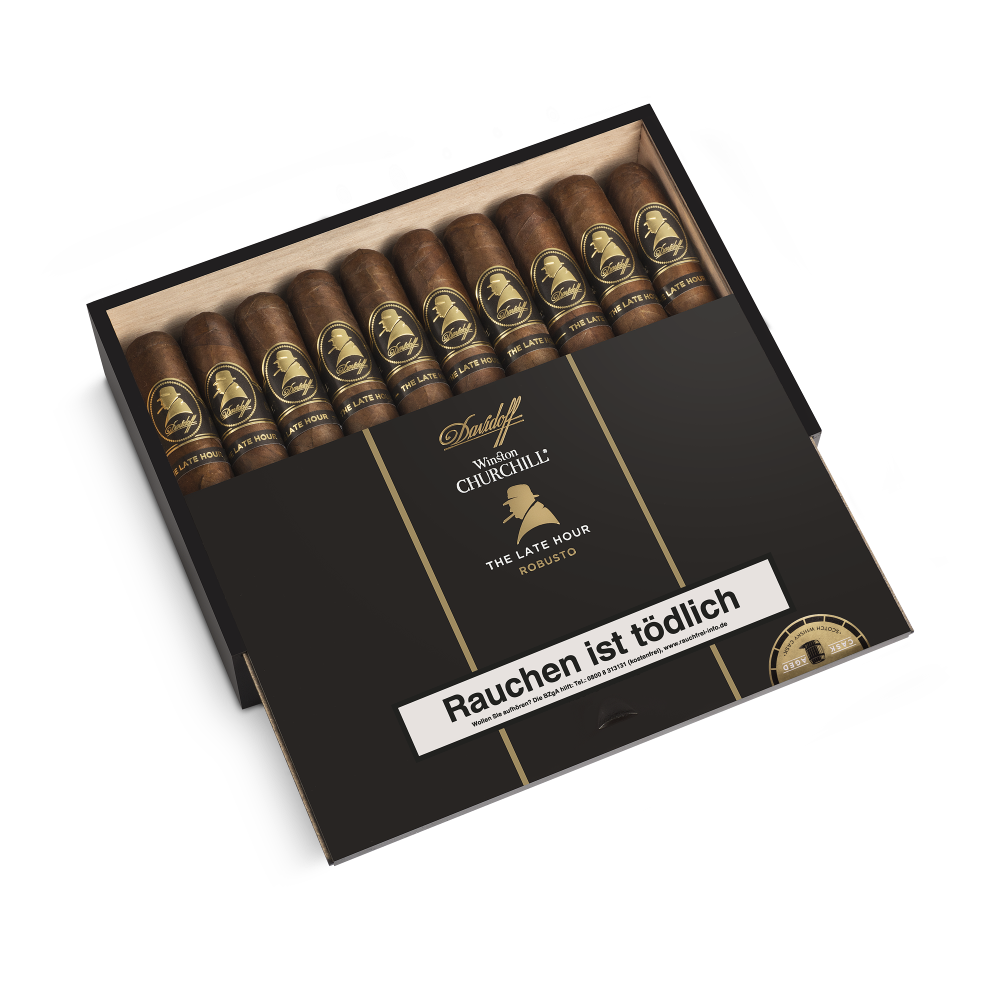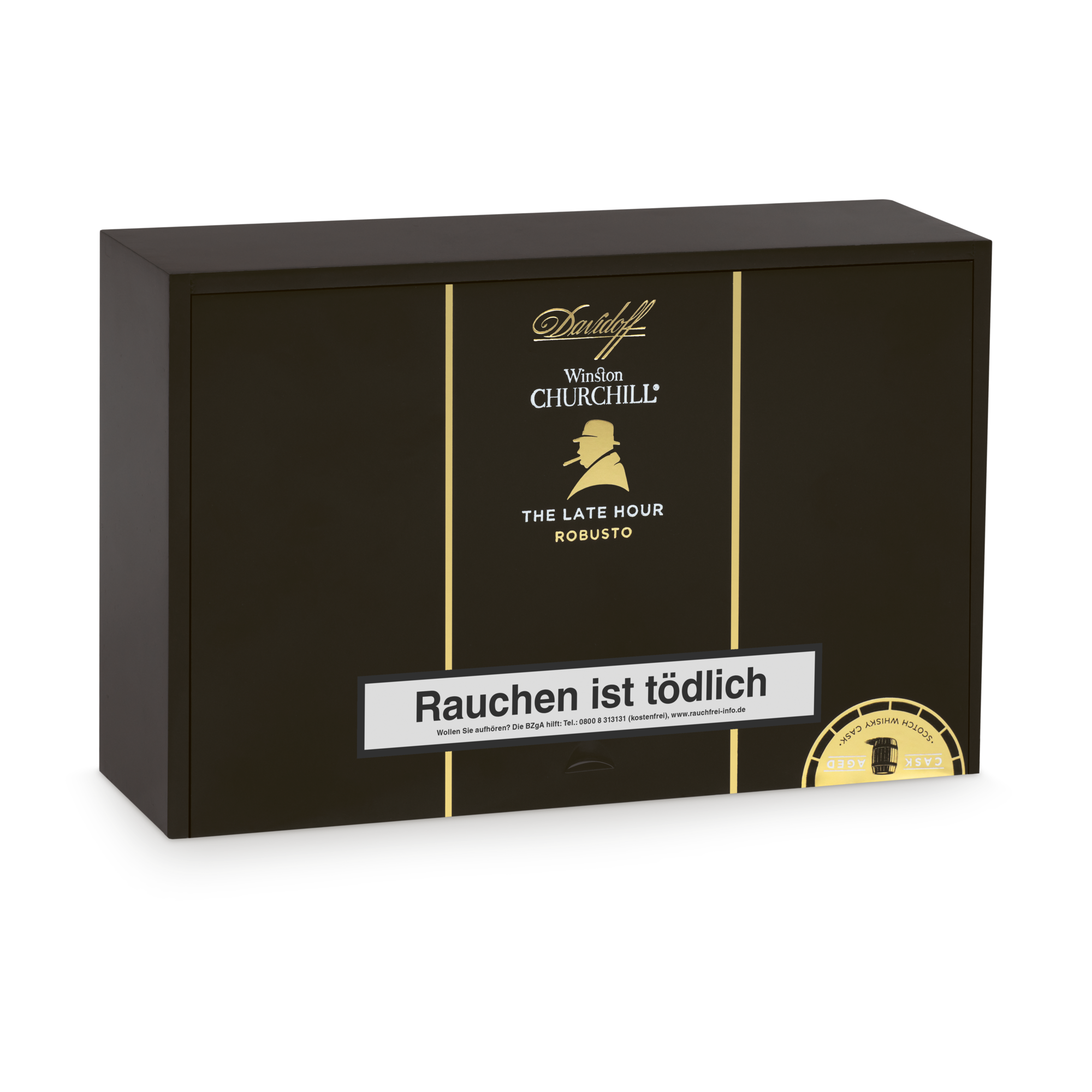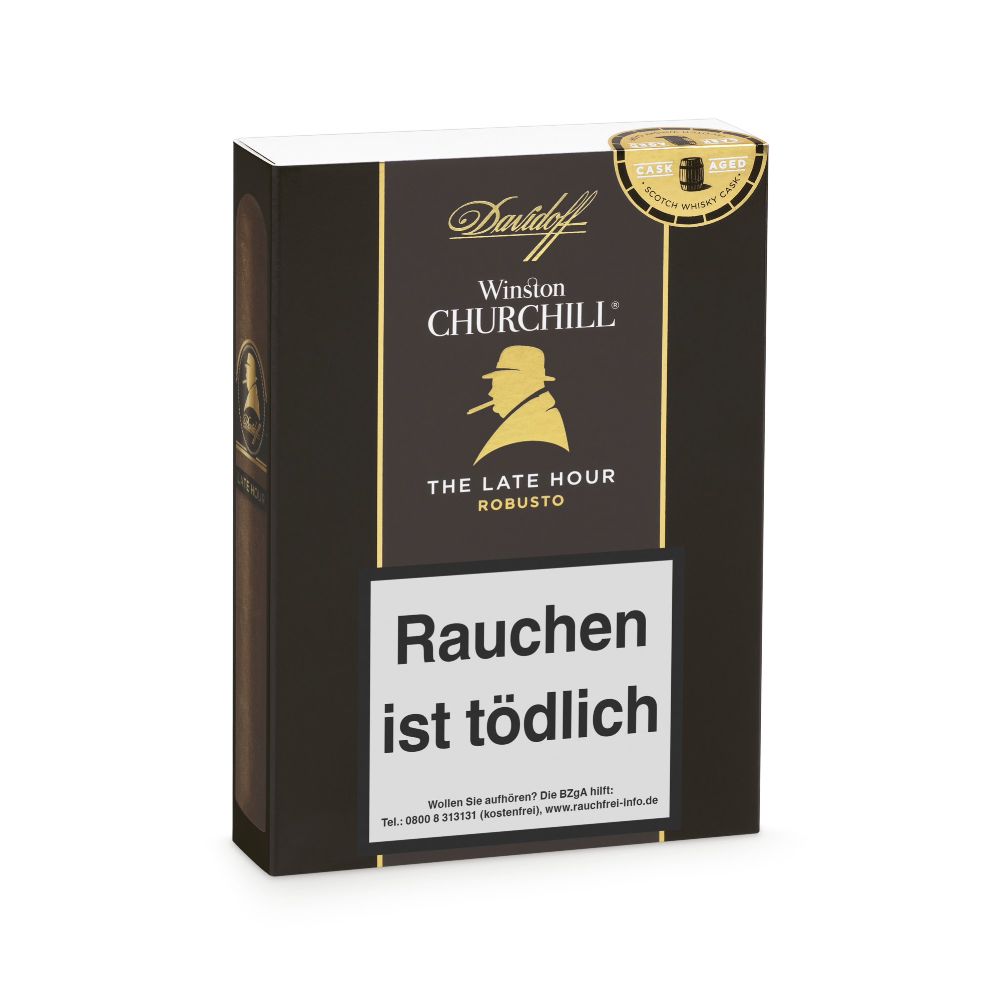 Wenn das Ende des Abends der Beginn von etwas Neuem ist. Und die Nacht von interessanten Gedanken und Diskussionen begleitet wird, ist dies der Moment für die - The Late Hour. Die Zigarre selbst sollte Gegenstand von Gesprächen sein, denn sie hat ihre eigene, einzigartige Geschichte. Ihr Tabak ist in Fässern von edelstem Scotch Single Malt Whisky gereift. Dies verleiht der Zigarre eine einzigartige Komplexität, Tiefe und ausgesprochen reiche Aromen, welche gleichzeitig Ihren Gaumen und Ihre Gespräche stimulieren werden. Die beiden Einlagetabake aus Nicaragua, die in den mineralstoffreichen Vulkanböden von Condega und Estelí angebaut werden, verleihen der Zigarre Würze und Charakter. Insbesondere der Condega Visus aus Nicaragua der in original Scotch Single Malt Whiskyfässern reift, geben der Zigarre eine mysteriöse Süße und geschmackliche Tiefe. Die beiden verschiedenen Visus Einlagetabake aus der Dominikanischen Republik und das dunkle mexikanische Umblatt, erzeugen zusammen die Komplexität dieser vollmundigen Mischung. Ausgeprägte Geschmacksrichtungen und Aromen verwöhnen den Gaumen mit wechselnden Noten von schwarzem Pfeffer, dunklem Kaffee, Süße, altem Leder, Holz und Würze. Um die Dunkelheit der Nacht wider zu spiegeln, in welcher Sir Winston am kreativsten war, hat Davidoff ein glänzendes und öliges Deckblatt aus Ecuador in einem satten, dunklen Schokoladenton ausgewählt.