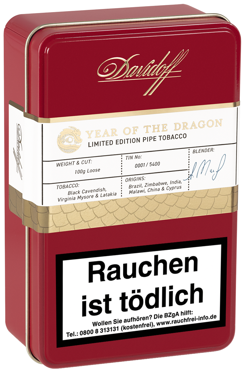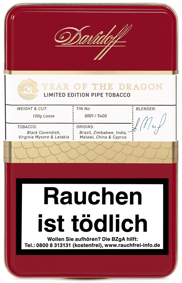 Der limitierte Year of the Dragon Pfeifentabak in seiner rot lackierten Dose ist von der Persönlichkeit des Drachen inspiriert. Die Edition ist die fünfte, die einem chinesischen Tierkreiszeichen einen Pfeifentabak widmet. Jedes Jahr lässt Davidoff sich von einem typisch asiatischen Geschmacksprofil inspirieren, um das der Pfeifentabak-Blend kreiert wird.