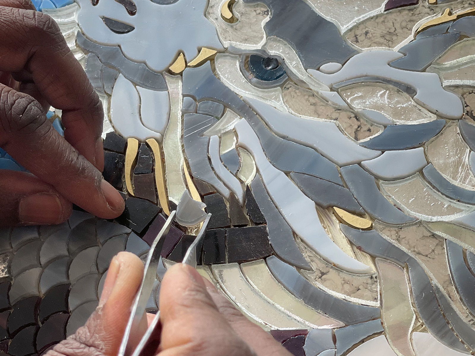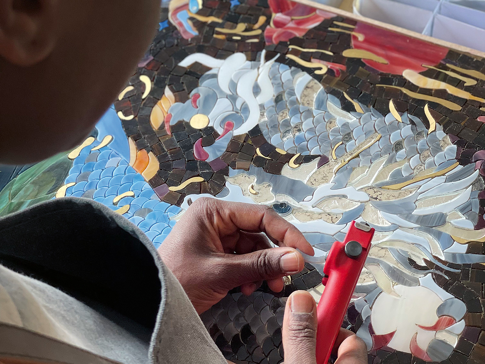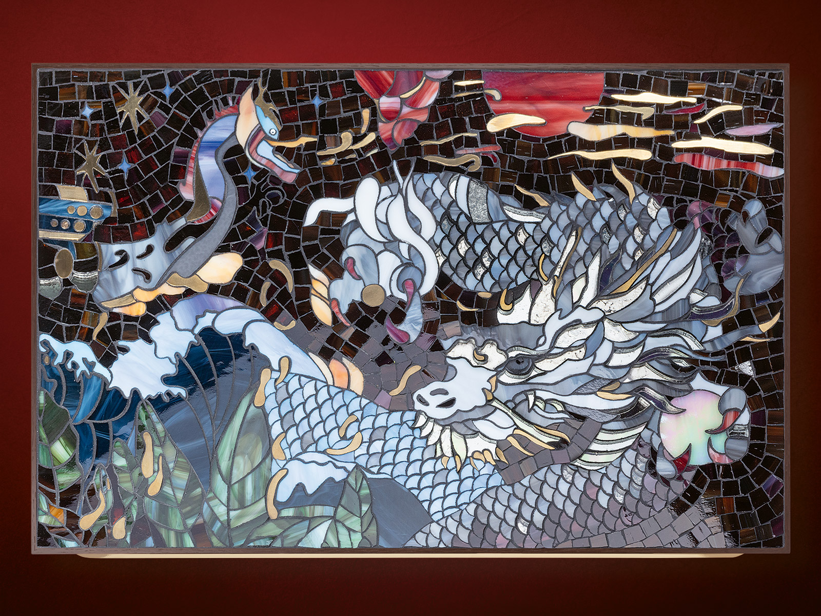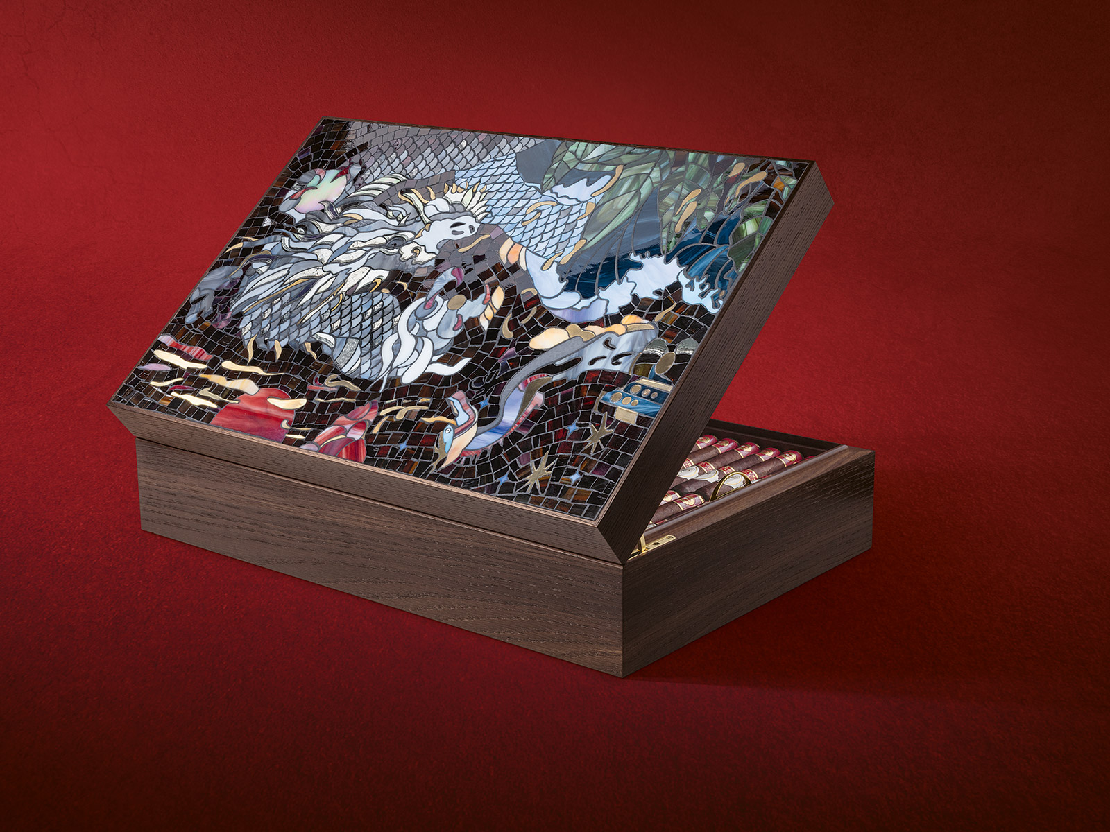 Das Kunstwerk auf dem eindrücklichen Year of the Dragon Masterpiece Humidor wurde vom chinesischen Künstler Zhang Zhaoying designt und von der französischen Mosaizistin Sika Viagbo in ein feines und faszinierendes Mosaik aus Glas- und Spiegelstücken übersetzt.