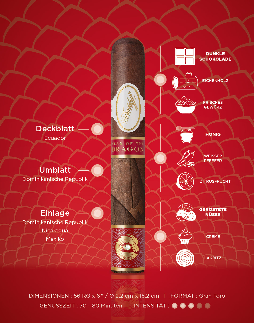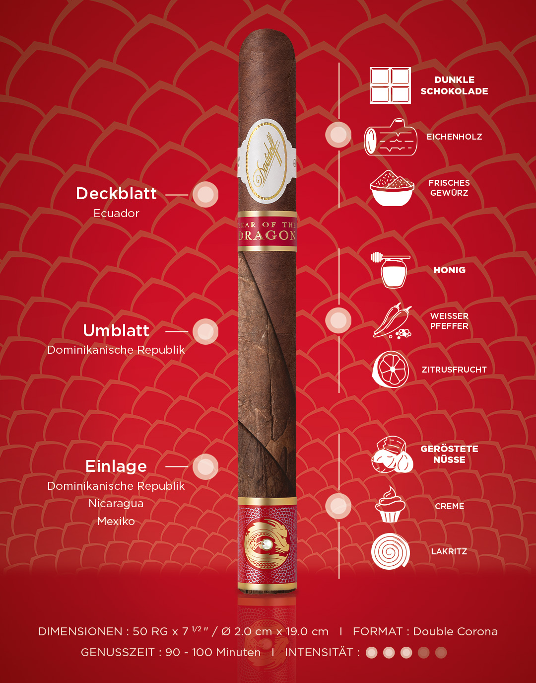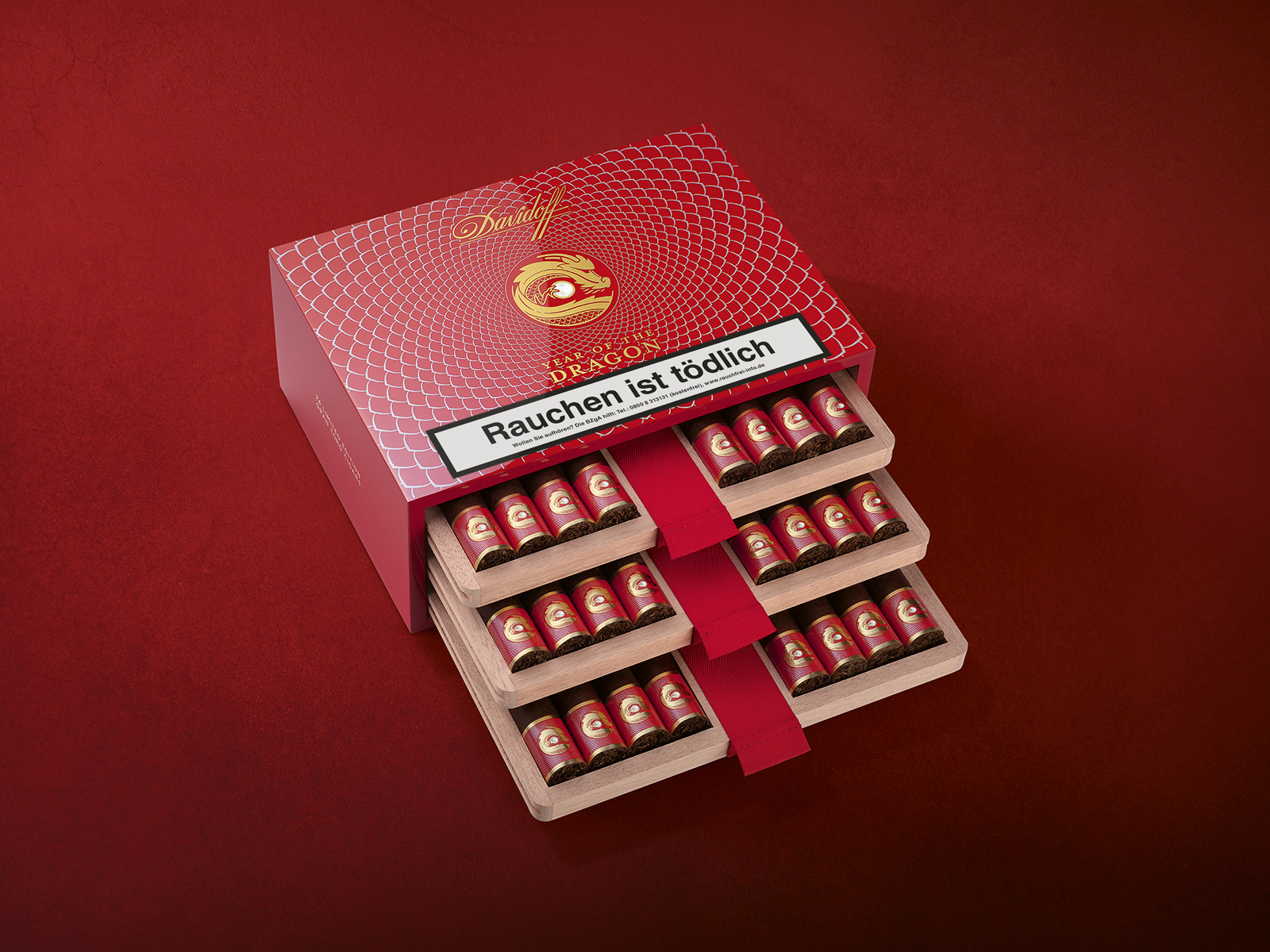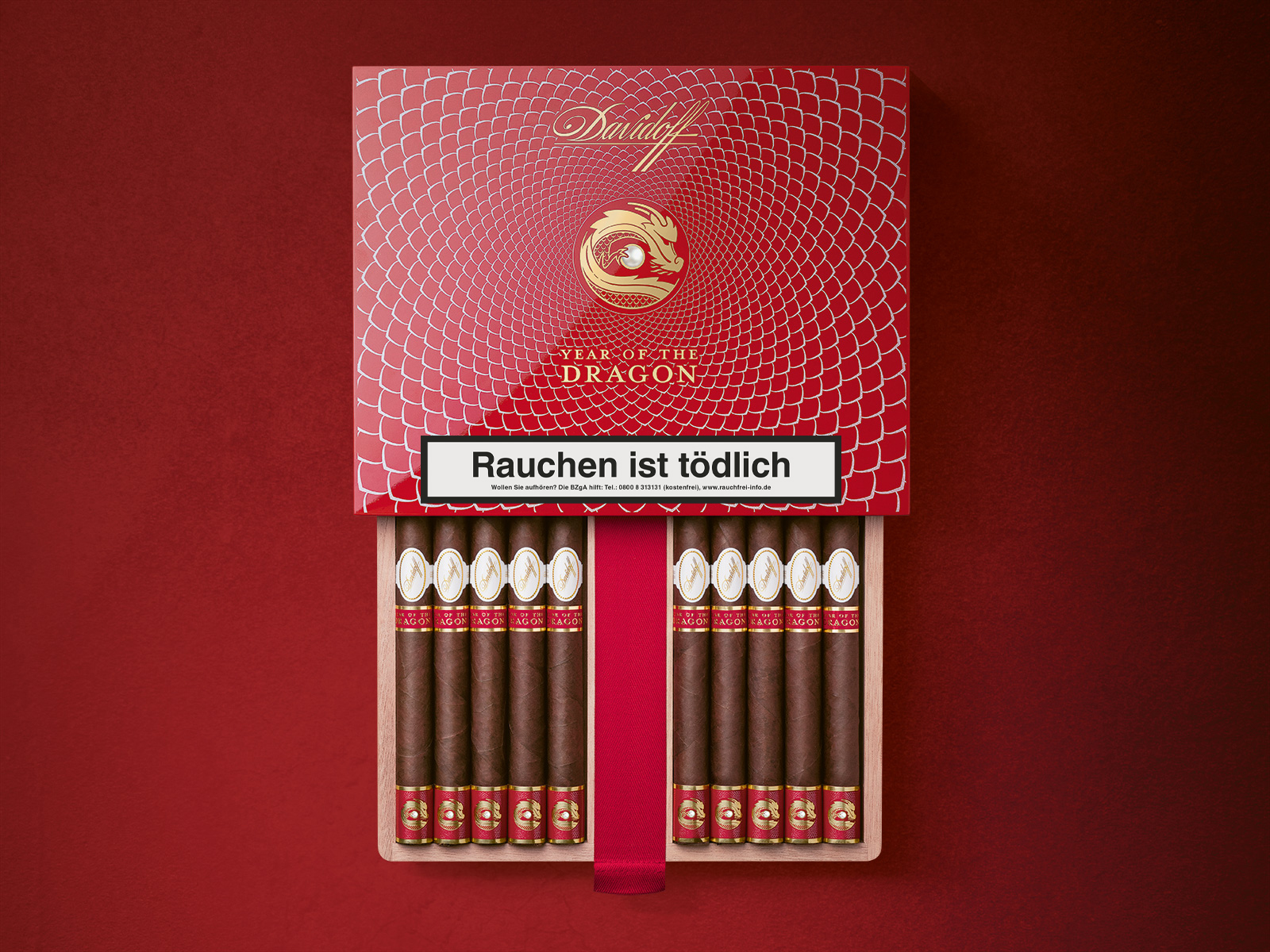 Mystische Rauchspiralen, die Geschichten aus einer anderen Welt erzählen, steigen aus der Zigarre des Drachen auf. Er ist ein geborener Anführer. Sein Wissen und seine Präsenz inspirieren andere dazu, ihm zu folgen. Und sie folgen bereitwillig. Aus seinem Mund kommt nicht nur Feuer, sondern auch Eloquenz. Der Drache ist von einer geheimnisvollen Aura umgeben und wird stets von Mystik und Erfolg begleitet. Und wie könnte er seine Triumphe besser feiern als mit den ebenso legendären Davidoff Year oft he Dragon-Produkten?